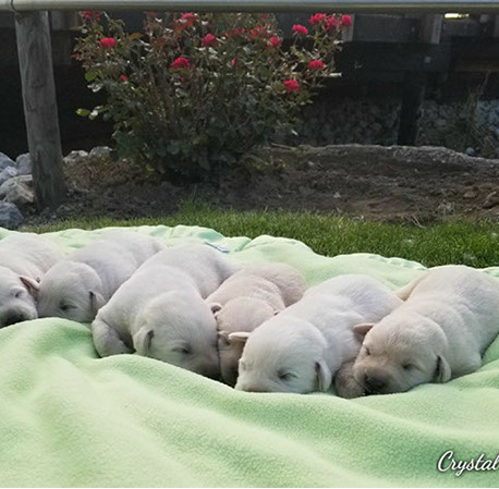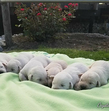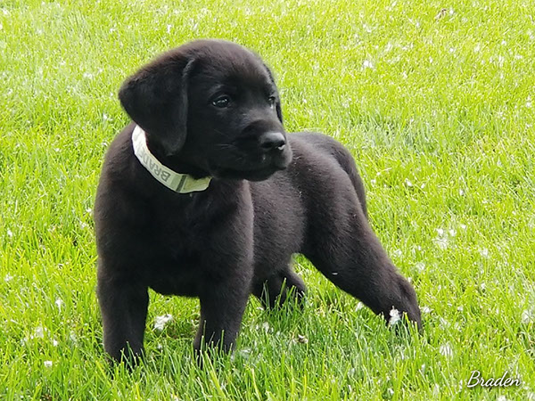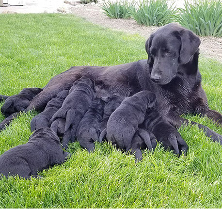 Puppies will come to you at 8 weeks after being vet-examined, with registration papers, dew claws removed, up to date vaccinations and deworming, a two day supply of puppy food, and a few of our great vitamins (NuVet Vitamins) that we use on our Lab-family.